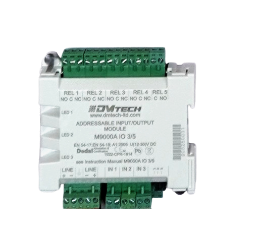M9000A IO 3/5 is an addressable module with 3 inputs and 5 outputs. The module supervises three input signals and drives five relay outputs.